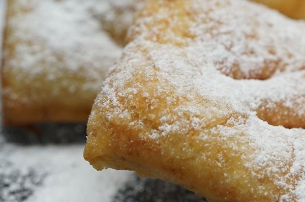 Zmiešajte múku, cukor, žĺtky, maslo a smotanu. Prilievajte víno a vypracujte cesto. Na pomúčenej doske cesto dokončite a vyvaľkajte na plát hrubý približne 5 mm. Narežte na požadované tvary a rozpáľte olej. Opražte z obidvoch strán do zlatista a odložte na papierové utierky, ktoré vysajú prebytočný tuk. Ešte teplé obaľte poriadne v práškovom cukre.