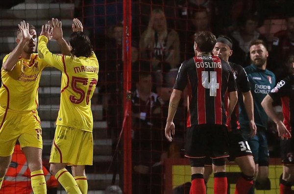 Mizériu uplynulého týždňa zahnal v 20. min. Raheem Sterling prvým gólom od septembra tohto roka. Stále iba 20-ročný krídelník sa strelecky presadil po 22 zápasovom pôste na klubovej aj reprezentačnej úrovni, keď hlavičkou poslal zblízka loptu do domácej siete. "Uplynulé týždne boli náročné, ale chlapci to zvládli naozaj dobre," povedal Sterling, ktorý v stredu pridal hneď aj gólovú dupľu. V 51. min dostal prihrávku do behu od Adama Lallanu, zamotal hlavu kapitánovi Bournemouthu Tommymu Elphickovi a prekonal brankára Artura Boruca. To už svietil na ukazovateli stav 0:3, pretože v 27. min sa lopta po strele Philippa Coutinha z uhla odrazila k Lazarovi Markovičovi a srbský stredopoliar si z hranice šestnástky otvoril liverpoolsky gólový účet. V bránke "The Reds" stál napriek trom gólom z Old Traffordu opäť Brad Jones a veľa práce nemal, až v 57. min ho ako jediný prekonal exevertončan Dan Gosling.