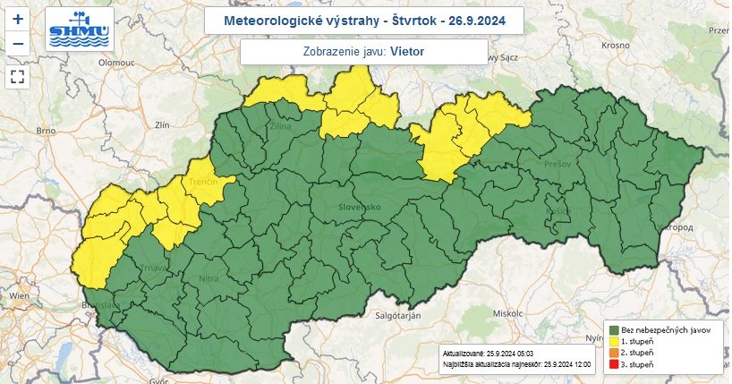 Vo štvrtok sa však predpokladá zosilnenie vetra, predovšetkým v okresoch Malacky, Myjava, Nové Mesto nad Váhom, Trenčín, Piešťany, Senica, Skalica, Kežmarok, Poprad, Stará Ľubovňa, Dolný Kubín, Námestovo, Tvrdošín a Čadca. Ojedinele sa očakáva výskyt vetra, ktorý dosiahne krátkodobo rýchlosť 65 až 70 kilometrov za hodinu a priemerne okolo 45 kilometrov za hodinu.