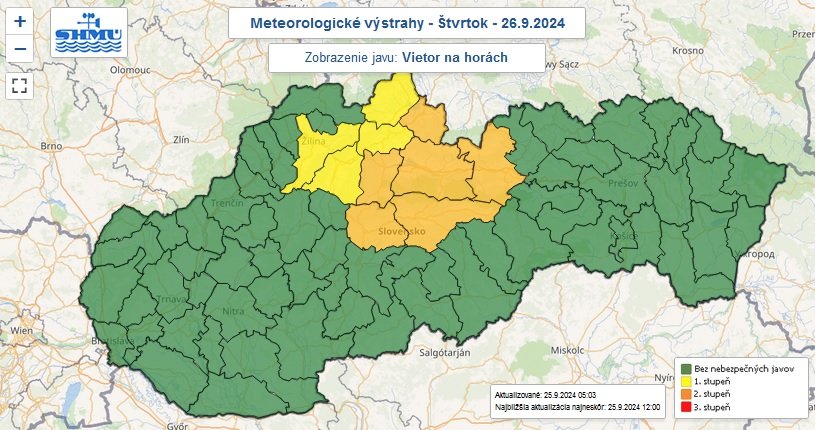 Varovanie prvého stupňa platí v okresoch Dolný Kubín, Martin, Námestovo a Žilina, a od 14:00 sa rozšíri aj na okresy, ktoré boli pod oranžovou výstrahou. Vo štvrtok sa najvyššia denná teplota očakáva na úrovni 20 až 25 stupňov, pričom na Orave, Liptove, Horehroní a Spiši bude miestami okolo 18 stupňov. Oblačnosť sa má zmenšovať najmä na juhozápade Slovenska k večeru.