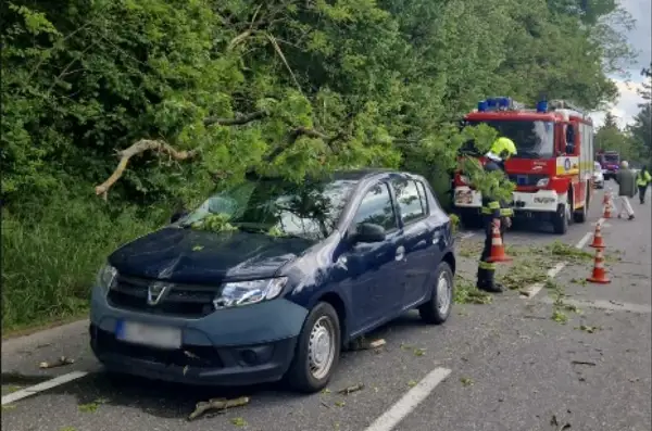 Na motorové vozidlo jazdiace týmto úsekom spadol z nezistených príčin strom. Premávka je riadená dopravnými policajtmi. Na mieste sa nachádzajú aj príslušníci hasičského a záchranného zboru.