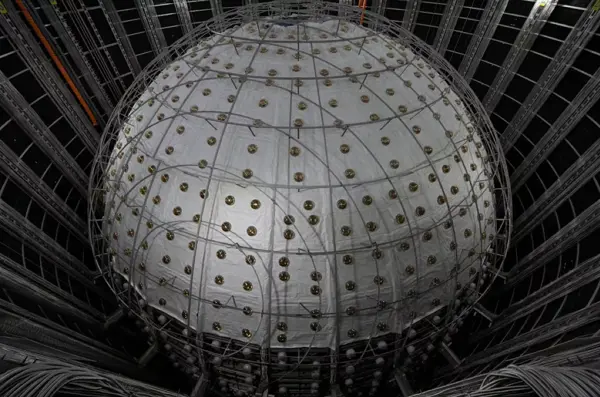 V srdci detektora je guľovitá nádoba, ktorú čoskoro naplnia špeciálnou kvapalinou citlivou na prechod neutrín. Táto kvapalina vytvorí svetelné signály, keď neutrína alebo ich protiklady, antineutrína, interagujú s časticami vo vnútri.